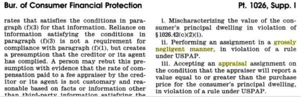 But big national mortgage companies today like Wells Fargo and others are reporting appraisals to state boards where the value is not supported. ie weak comps, unreasonable adjustments, etc. Reports with those issues may, in fact, be negligent but do not fall under the definition of gross negligence. Let’s not wreck an appraisers career because they missed some better comps. Once these reports are referred to the state, the state must investigate. It opens up the appraiser to more risk of unintended consequences. Think of a scenario where a cop pulls over a driver for a missing taillight and learns that the driver doesn’t have his wallet with him.