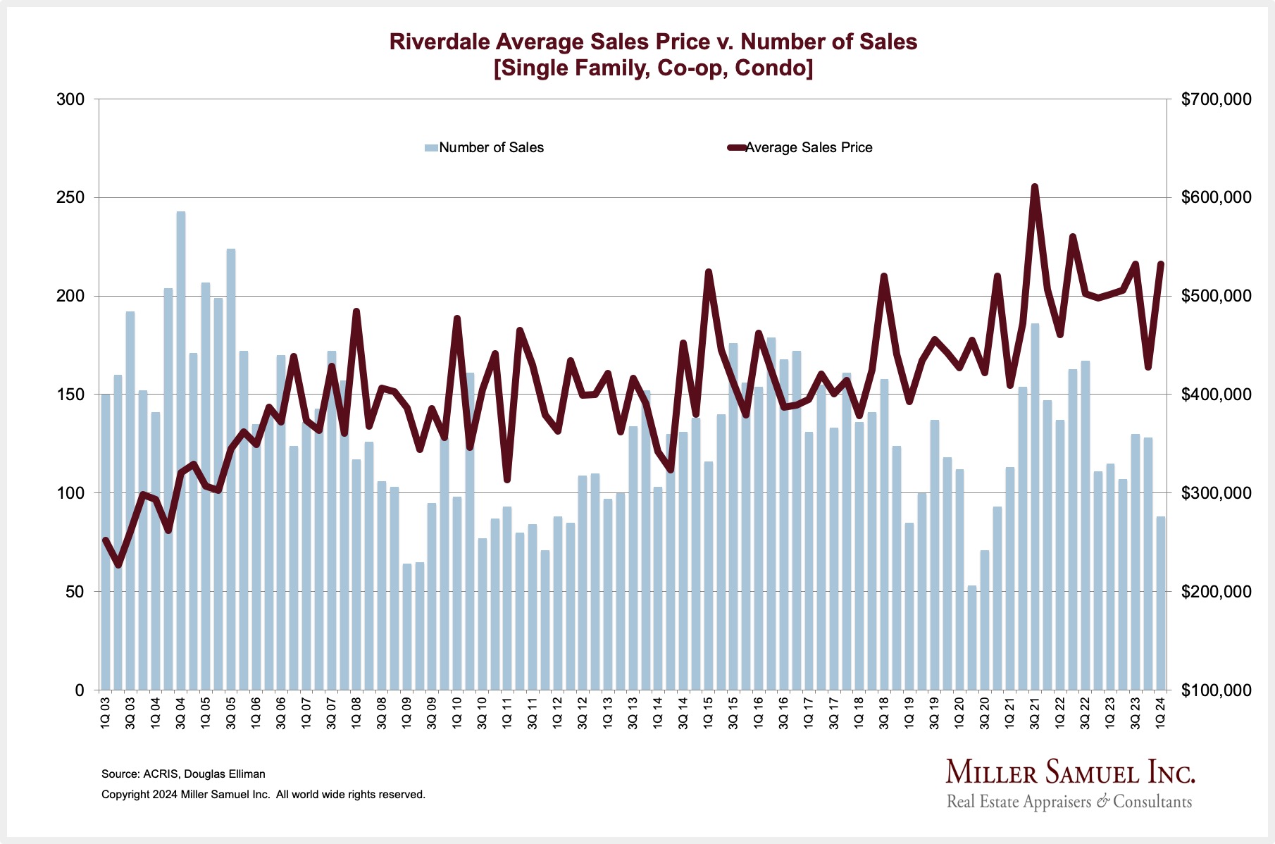 Riverdale Average Sales Price v. Number of Sales [Single Family, Condo, Coop]