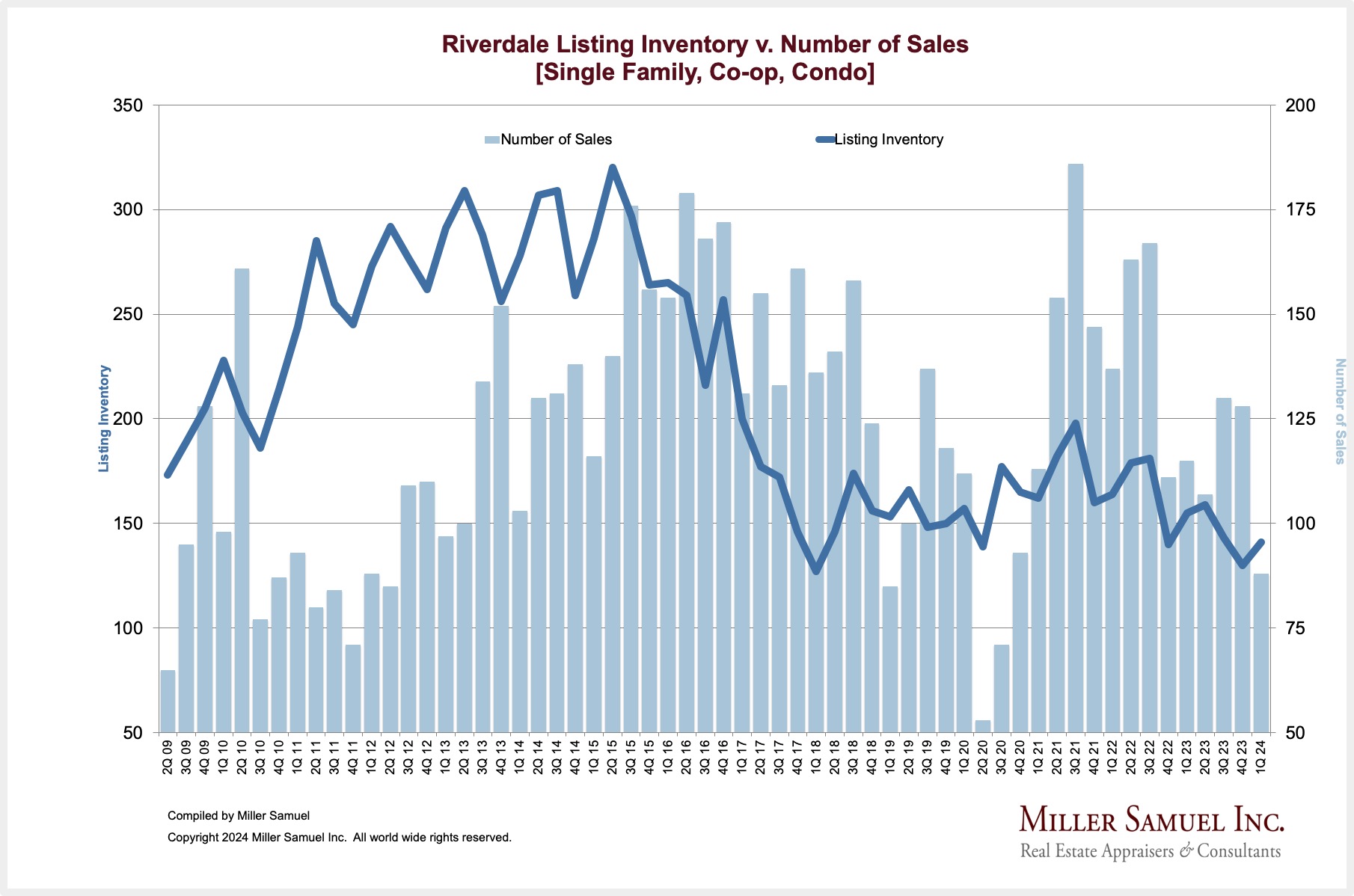 Riverdale Listing Inventory v. Number of Sales [Single Family, Co-op, Condo]