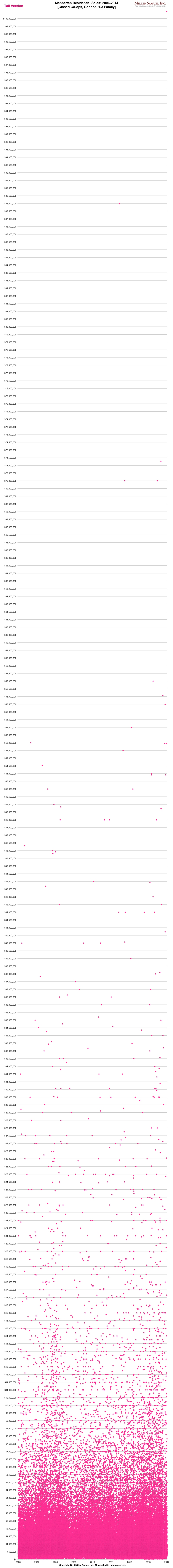 This week I ended up writing a piece about tall towers in my Bloomberg View column called Living the High Life, another one on Curbed NY for my Three Cents Worth called Proving New York’s Blockbuster $100M Sale Is An Outlier which provided some needed context for the new record sale in the following scattergraph. Note the $100.47M record sale in the upper right hand corner and then scroll down…a lot.