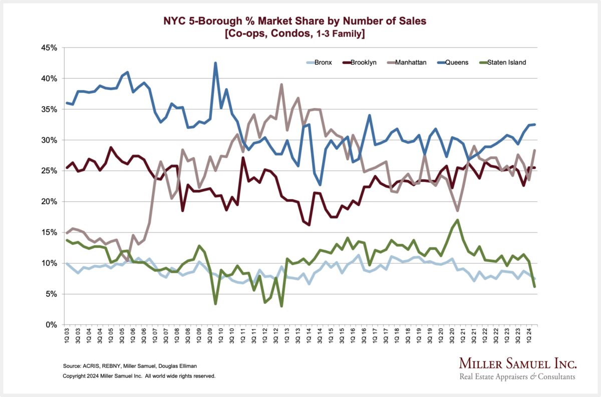 NYC 5-Borough % Market Share by Number of Sales [Co-ops, Condos, 1-3 Family]