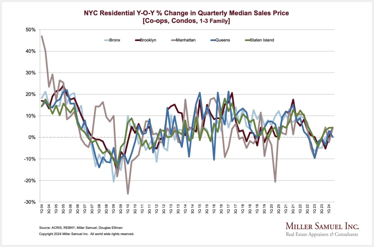 NYC Residential Y-O-Y % Change in Quarterly Median Sales Price [Co-ops, Condos, 1-3 Family]