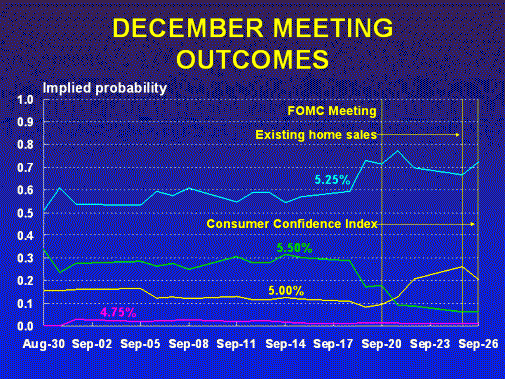 The probability of holding at 5.25% is less in December and there was some uptick in the probability that the rate could move down to 5%.  This is something to watch for as economic stats are released this fall.  More bad news will improve the probability that 5% is the new federal funds rate change.  Although I like those odds, right now it doesn’t look like it will happen unless more bad news is on the way.