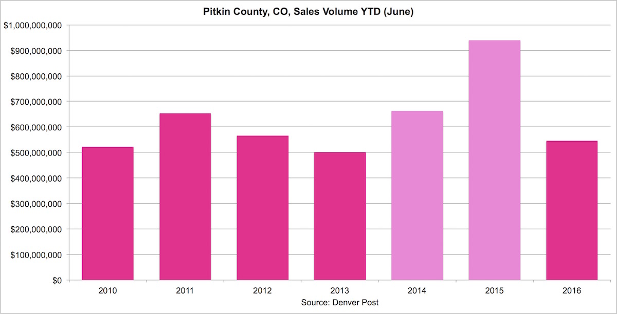 If you use the article’s June year to date residential sales volume for the entire county, it is clear that 2015 was an outlier. However because most real estate brokers on commission tend to look at the market in the short run, there was an expectation that the sales trend from 2014 to 2015 would continue into 2016. Because of the uncertainty described in the article, Aspen buyers – who are by definition “luxury” buyers – are clearly pulling back (and in many U.S. luxury markets).