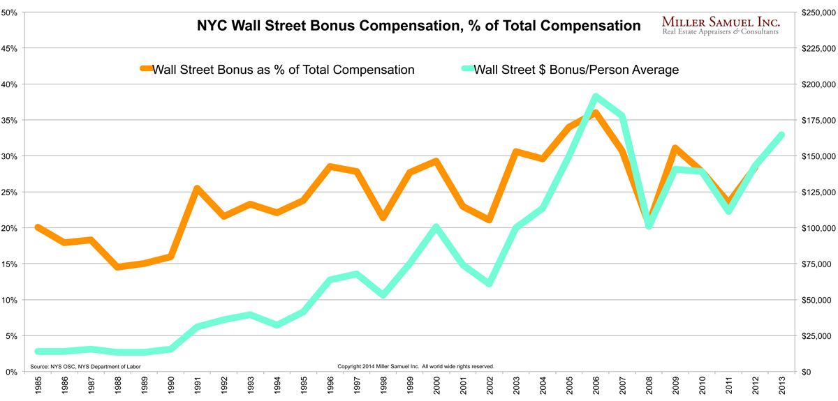 Wall Street bonuses rose steadily as a portion of total compensation but after the 2008 stock market correction and financial reform, the market share fell – but not as much as perceived.