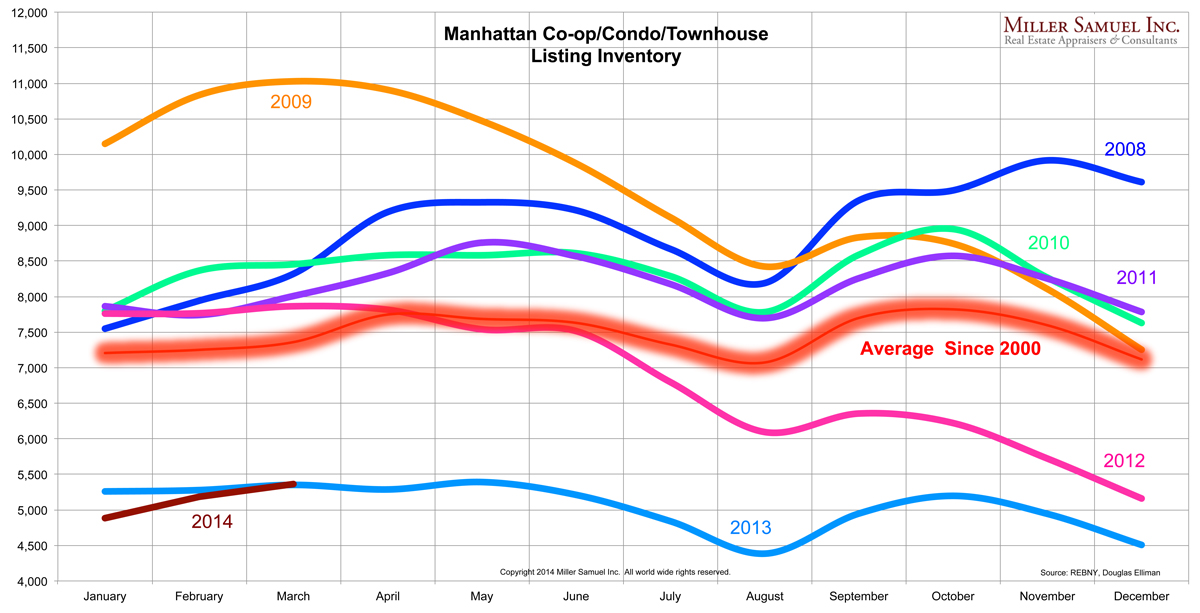 No meaningful rise in inventory in the last 3 months overall supply appears to be leveling off per the recently released 1Q14 Manhattan sales report we authored for Douglas Elliman.