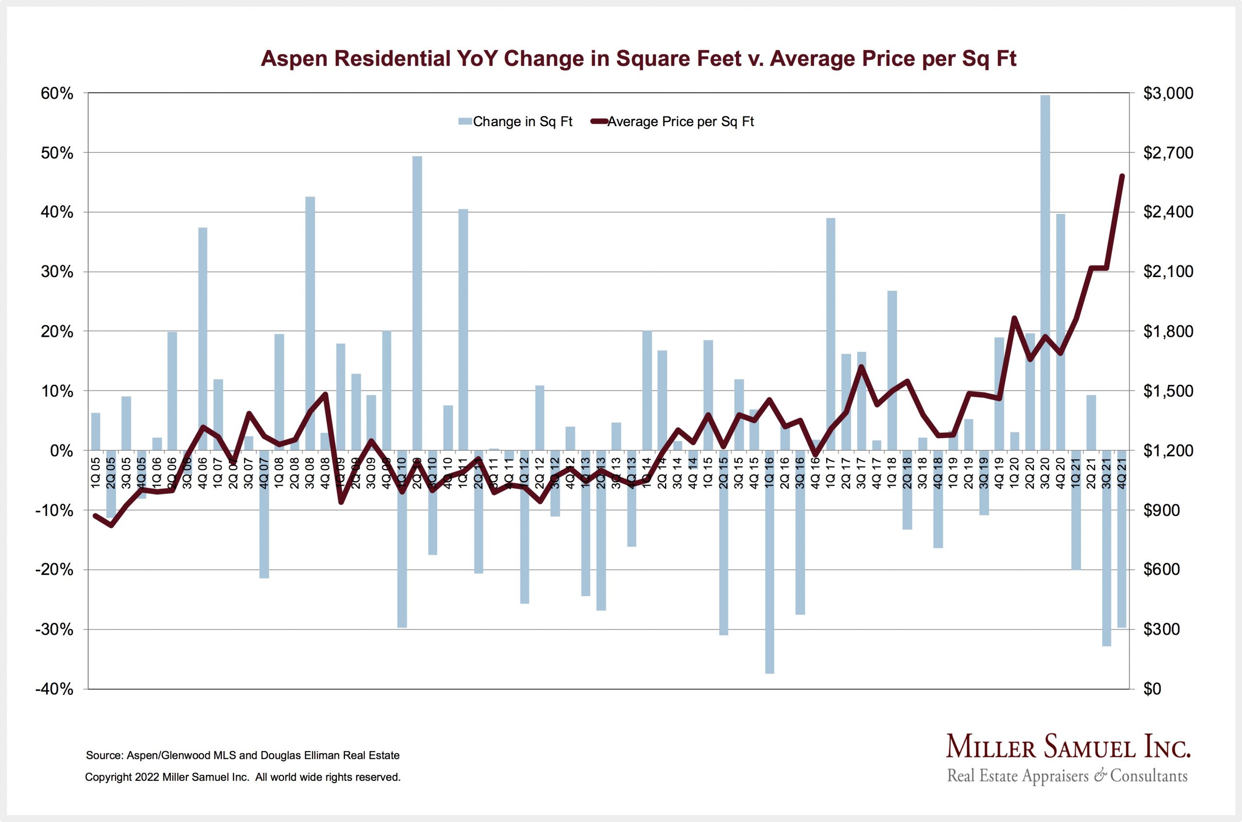 Aspen Residential YoY Change in Square Feet v. Average Price per Sq Ft