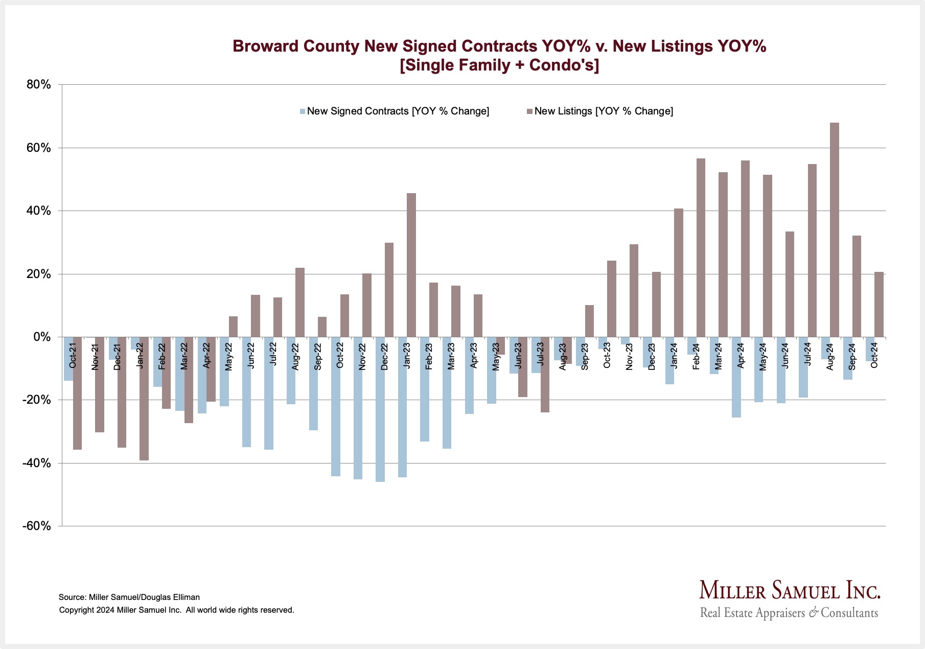 Broward County New Signed Contracts YOY% v. New Listings YOY% [Single Families + Condos]