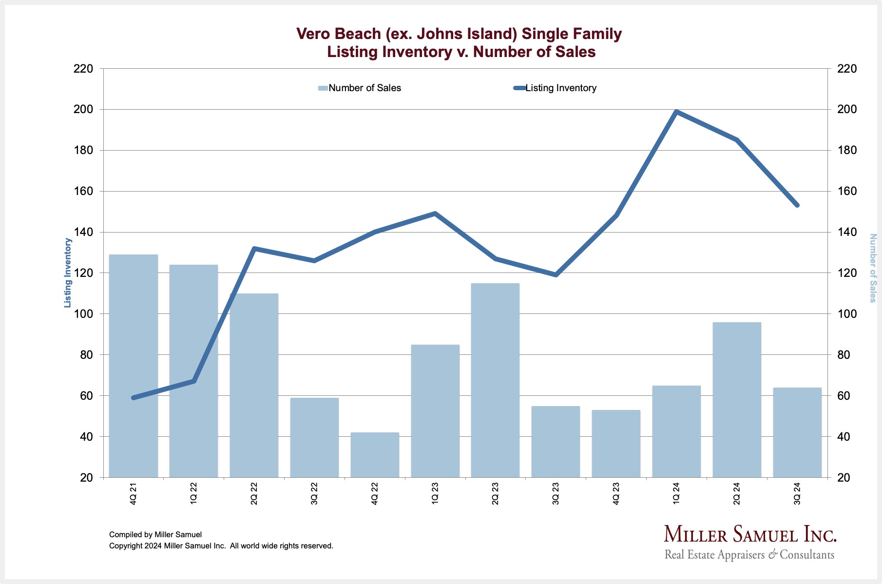 Vero Beach (ex. Johns Island) Single Family Listing Inventory v. Number of Sales