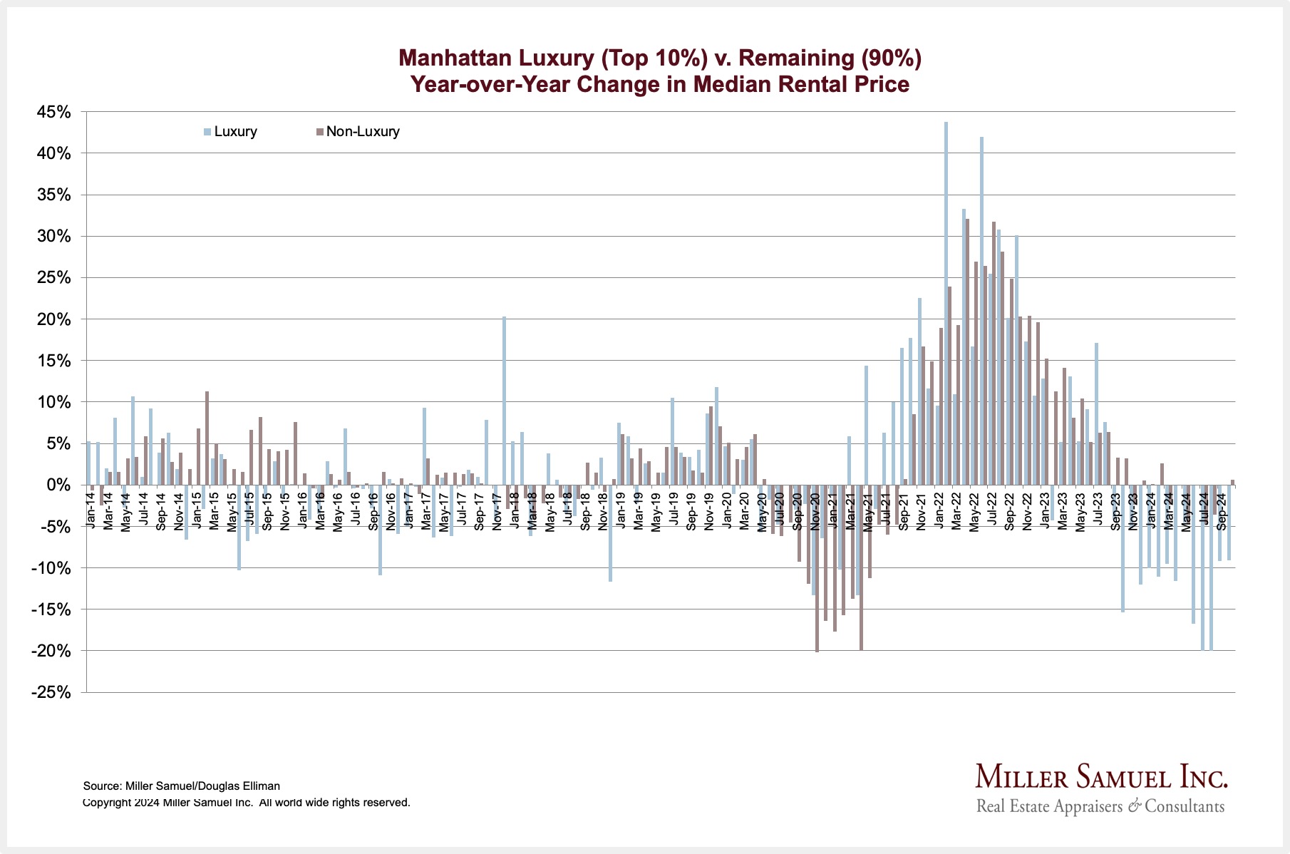 Manhattan Luxury (Top 10%) v. Remaining (90%) Year-over-Year Change in Median Rental Price