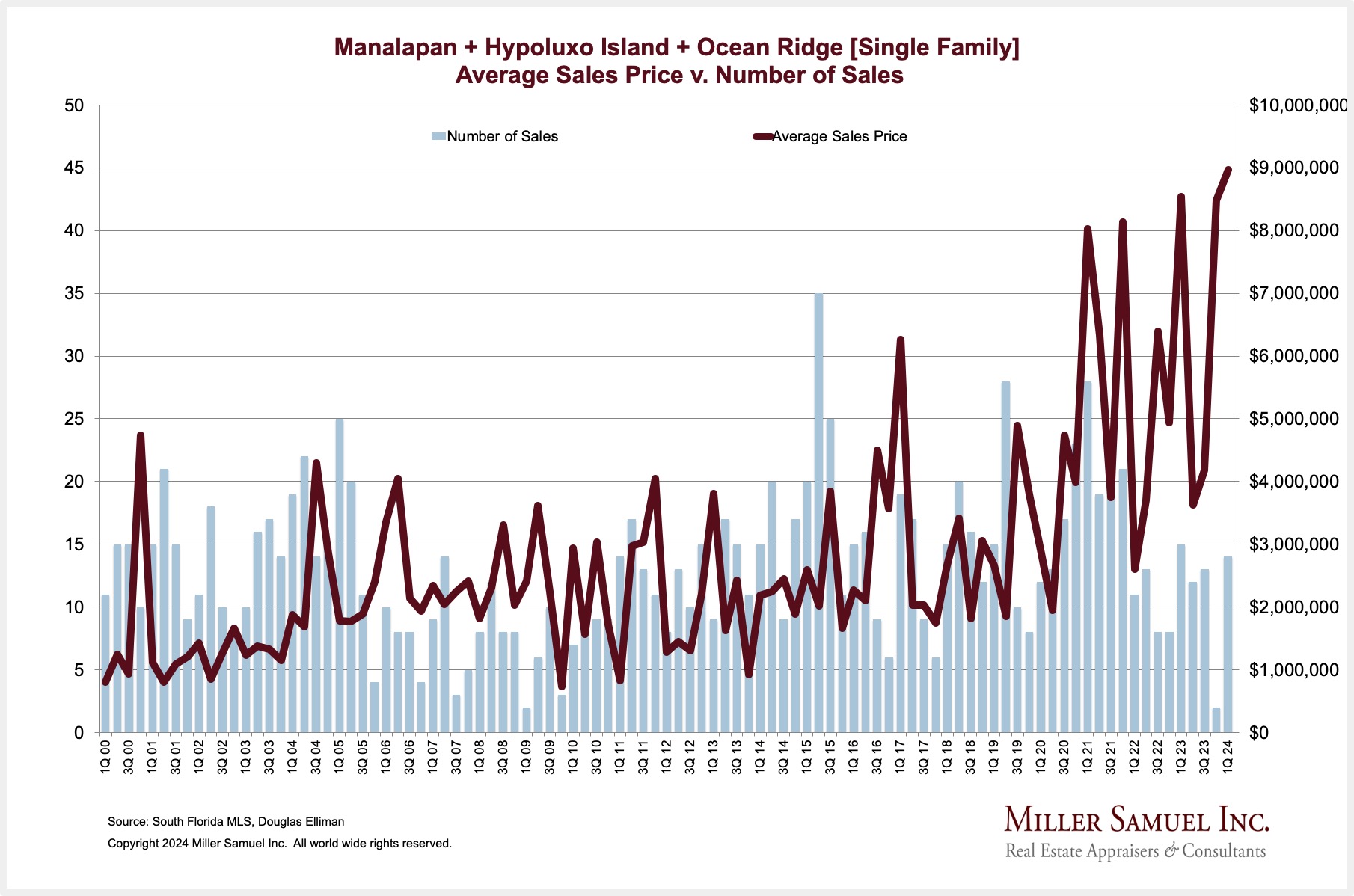 Manalapan + Hypoluxo Island + Ocean Ridge [Single Family] Average Sales Price v. Number of Sales