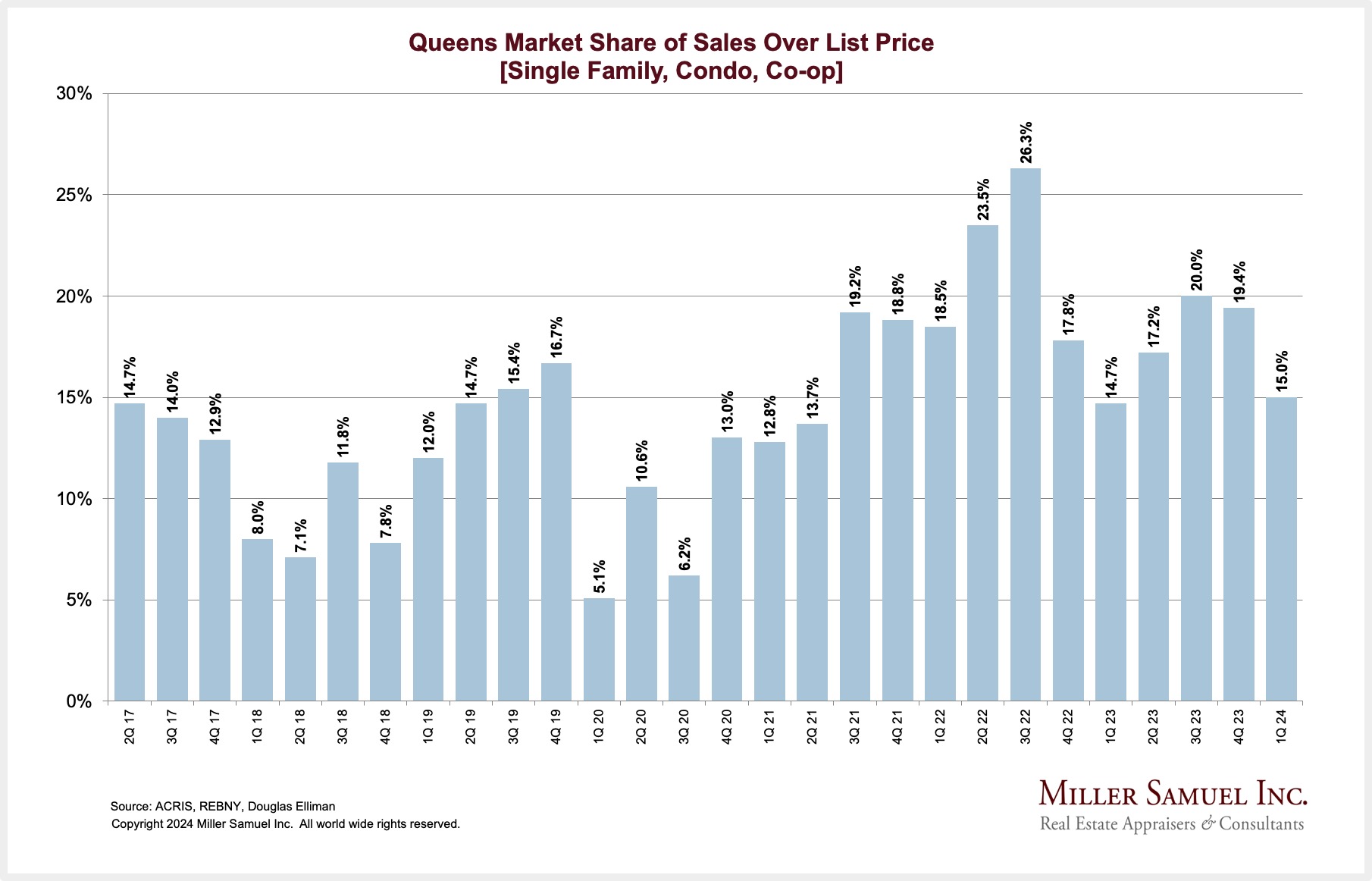 Queens Market Share of Sales Over List Price [1-3 Family, Co-op, Condo]