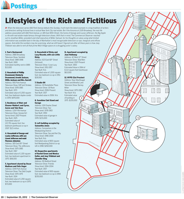 In lieu of the new TV show 666 Park Avenue (the devil passed the board interview apparently), the Commercial Observer asked me for some thoughts on the value of some fictitious apartments and properties in some notable TV shows using what limited information was available back in the day and some strained logic (with a slew of hypotheticals and disclaimers) all in the name of fun.