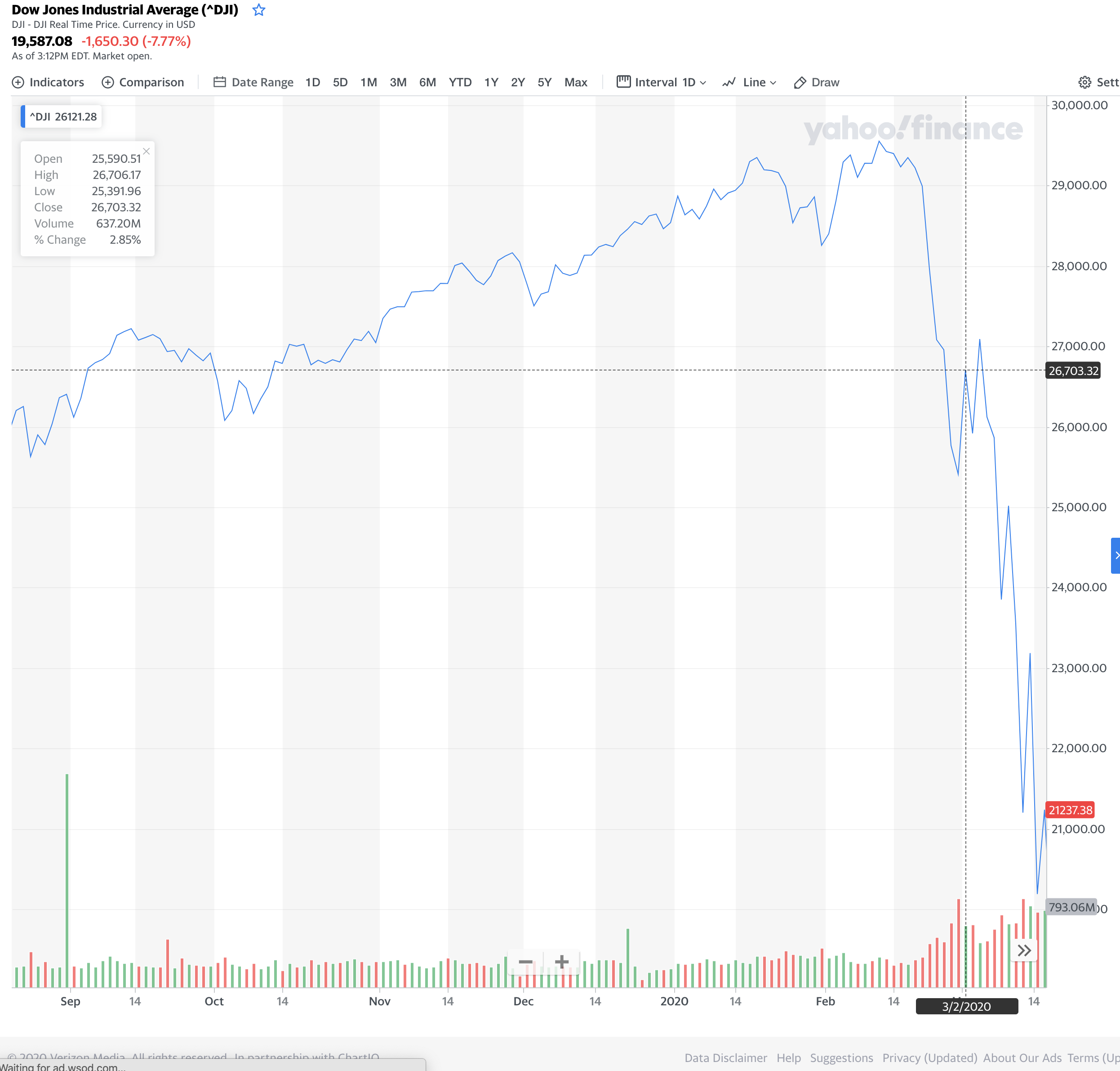 Since the 2020 DJIA peak of February 12, 2020, of 29,551.42, the market has fallen 28.13% to 21,237.88 as of the late afternoon, an insanely large decline.