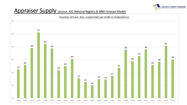 The ratio of appraisers to mortgage volume has been higher since the housing bust than during the housing boom. While the chart only goes to 2015, both total origination and appraisers have changed little since then, so the ratio would remain stable, consistent with the post-financial crisis pattern. In other words, there are more appraisers now than there were during the Housing Bubble based on mortgage volume.