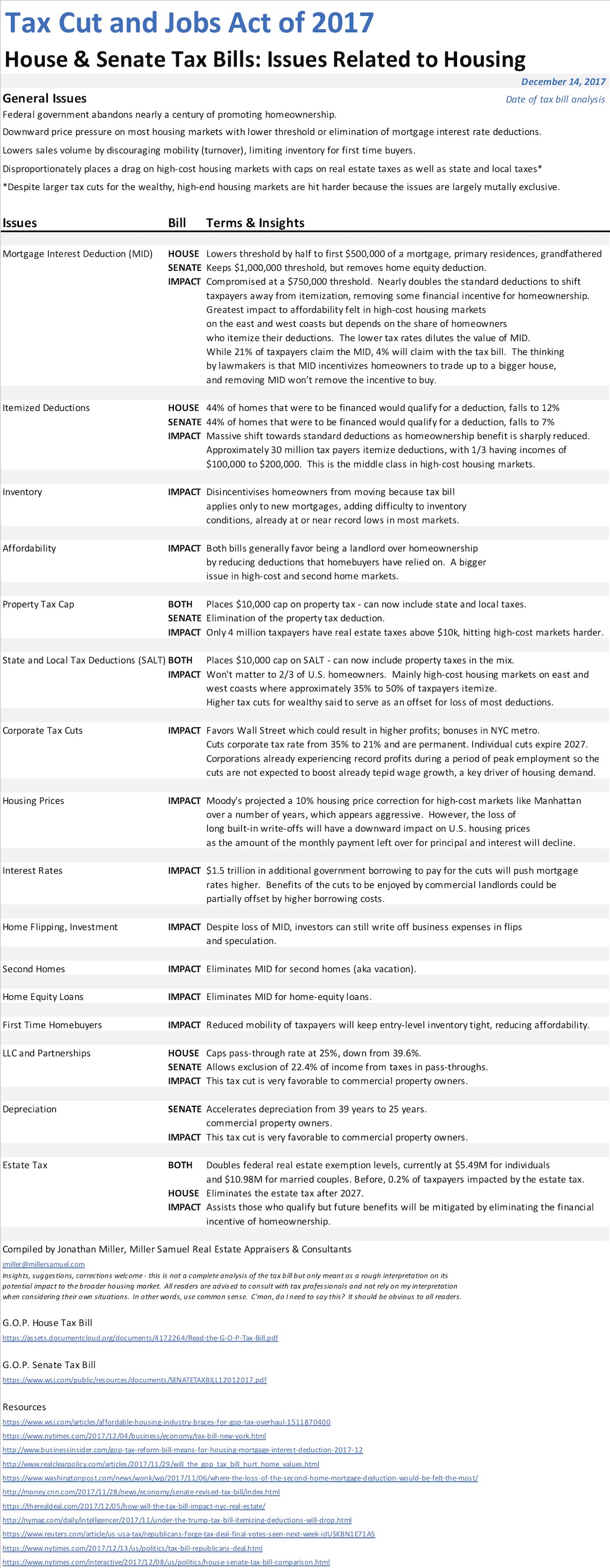 Unlike the 1986 tax reform bill, which took six months of public hearings and discussion on both sides of the aisle, this tax bill was worked on for a year by the GOP and was passed very quickly without most of the signers knowing what was actually in it. Therefore I anticipate an ongoing procession of additional insights that impact the housing market as more people read the bills or the eventual law.