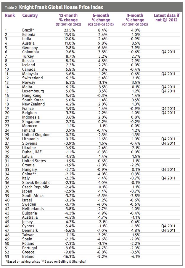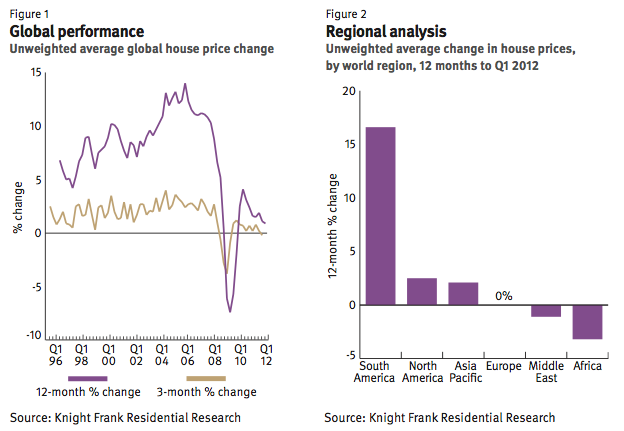 Knight Frank published their The Global House Price Index recorded its weakest annual performance since the depths of the recession in 2009, recording only 0.9% growth in the year to March 2012. Doubts over the Eurozone’s future, along with the Asian governments’ staunch efforts to cool their markets and deter speculative investment, have taken their toll.