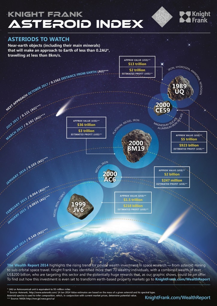 The Wealth Report 2014 highlights the rising trend for private wealth investment in space research — from asteroid mining to sub-orbital space travel. Knight Frank has identified more than 70 wealthy individuals, with a combined wealth of over US$200 billion, who are targeting this growth sector. The investment promises to transform terrestrial property markets.