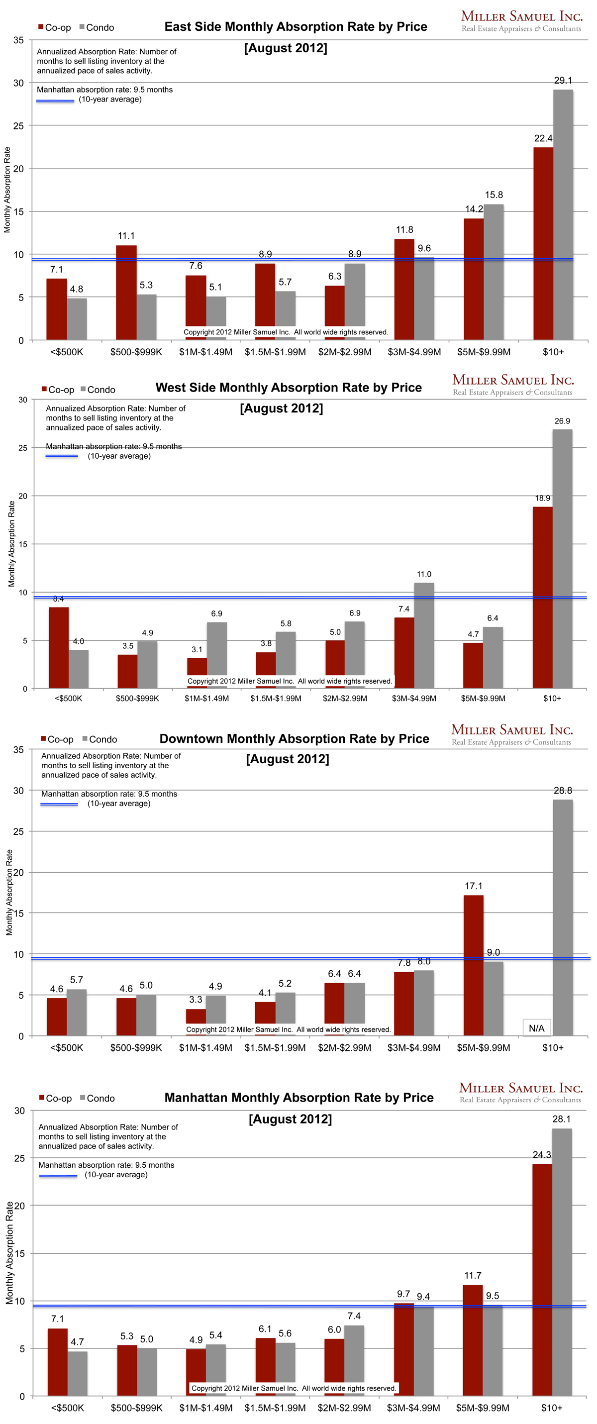 Compared to last year, everything below $5M (all but a few % of the market) is flying off the shelves as evidenced by very fast absorption rates. The $1M to $1.49M Manhattan co-op market is seeing absorption rates as low as 2.4 months, an incredibly fast pace. The weakest segment appears to be $5M and $10M+ condos, which are seeing absorption rates of about 12 months and 28 months respectively. High end co-ops, especially those above $10M (<1% of the market) are also absorbing slowing, averaging about 16 months. The balance of the co-op market (nearly all of it) is being absorbed faster than the 10 year average absorption rate. _______________________ Manhattan Market Absorption Charts 2013 [Miller Samuel] Manhattan Market Absorption Charts 2012 [Miller Samuel]