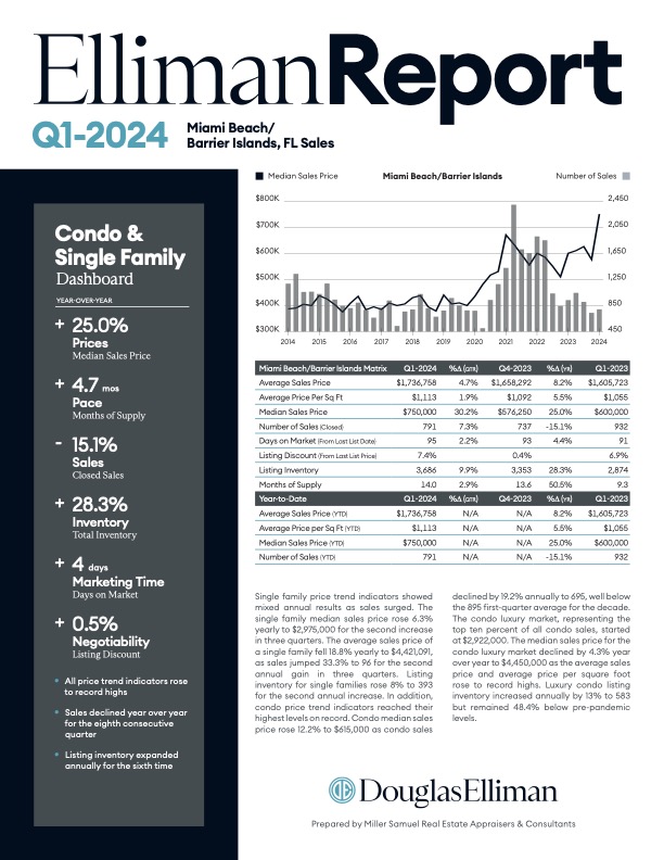 Elliman Report: Miami Beach + Barrier Islands Sales 1Q 2024