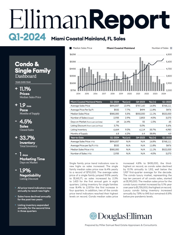 Elliman Report: Miami Coastal Mainland Sales 1Q 2024