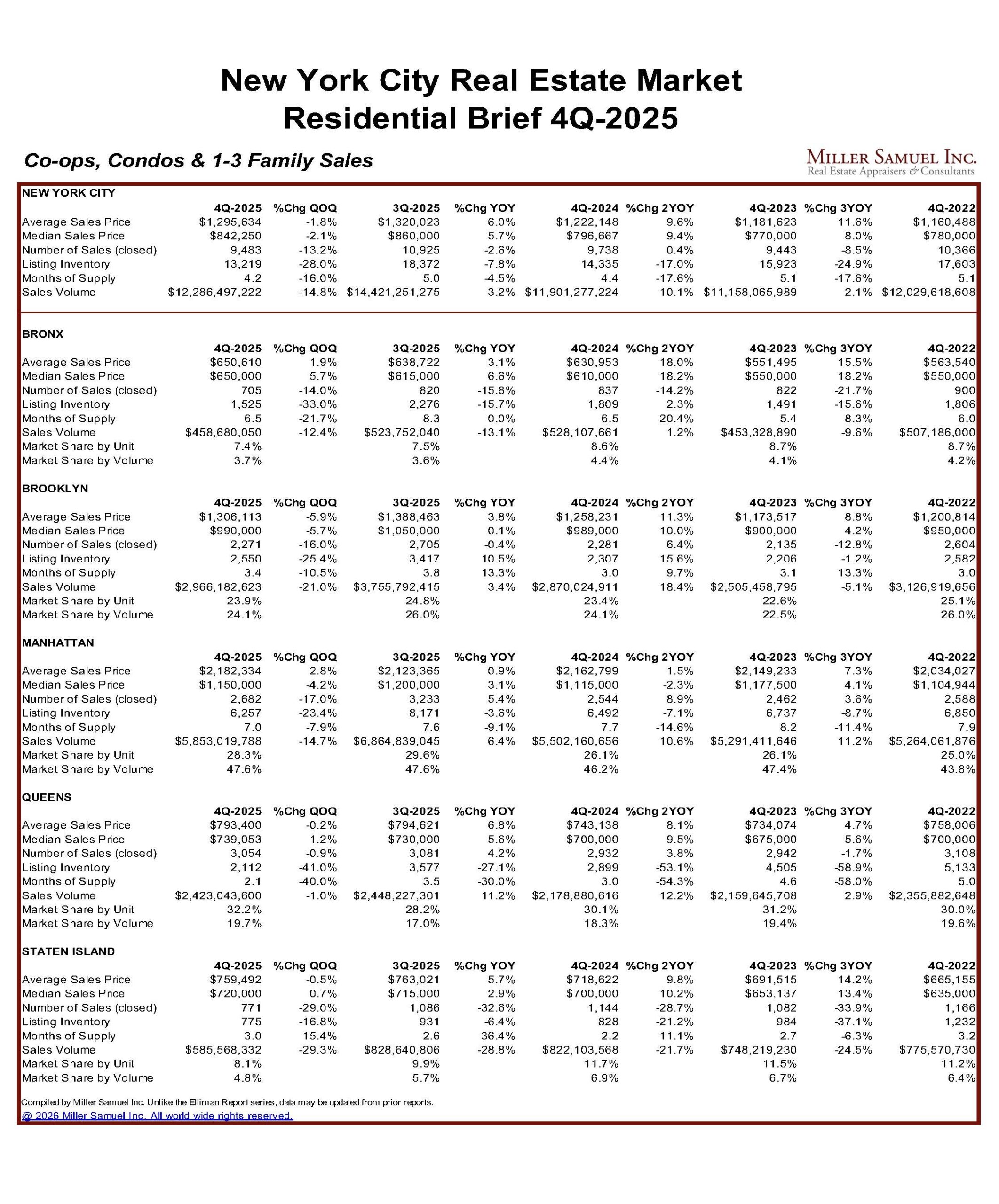 Miller Samuel began preparing market reports for Douglas Elliman in 1994. This initial research effort has evolved into an expanding series covering a wide array of housing types in many markets. The distribution of the series in both print and download exceeds more than 1,000,000 copies per year.