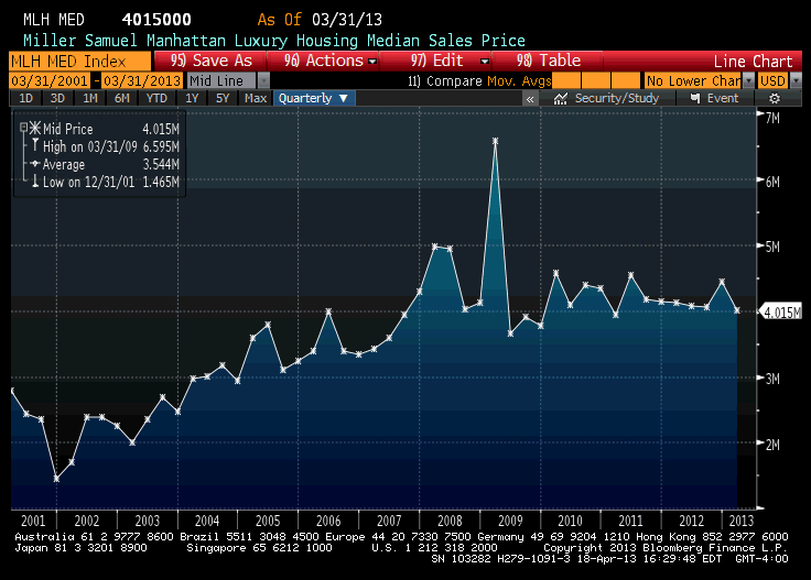 A while ago Bloomberg created three luxury housing indices using our Manhattan historical data for their terminal subscribers. Kinda cool. For all the high end housing market hype, the upper end has remained fairly stable for several years. That may change a bit going forward (higher).