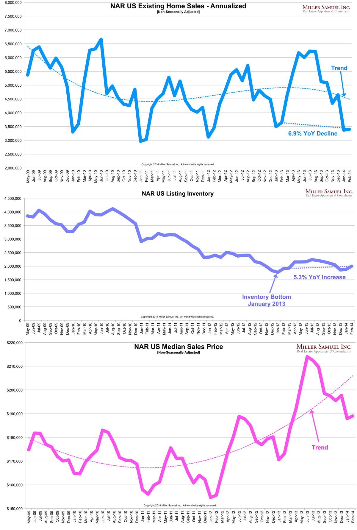 Of course inventory has been near historic lows for a few years so that’s not a new reason. I’m left with the weather and as someone who hates to use the weather as a crutch, it seems to be a pragmatic – it’s difficult to show or be in the mood to view properties when it is zero degrees outside. The weather explanation was also used in the prior report but those contracts were signed in December for the January report, before the “polar vortex.”