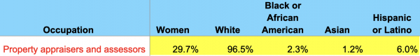 So I looked at U.S. labor force data from the U.S. Bureau of Labor Statistics [BLS], which ranked the top 400 occupations by sex, race, and Hispanic or Latino ethnicity. I’ve been an appraiser for 35 years and it’s been very clear that there is nominal diversity in my profession. For users of the industry’s services who have constantly complained about “appraisal shortages” (translated: a shortage of appraisers willing to work for 50% to 75% below the market rate) – here is your opportunity for action to expand our ranks.