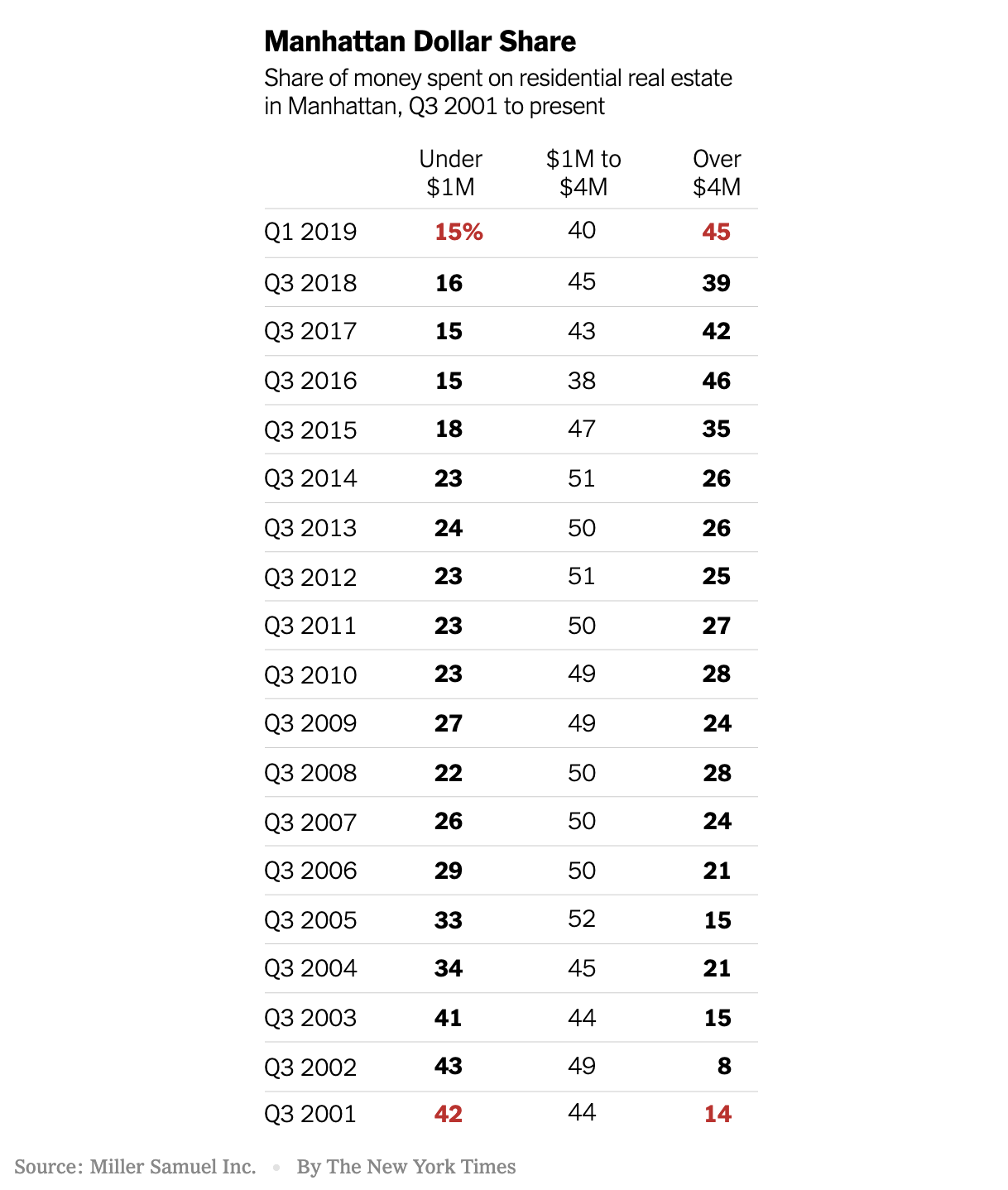 Almost half the money spent by New York City home buyers in the first quarter of 2019 went toward the most expensive properties. That wasn’t always the case.