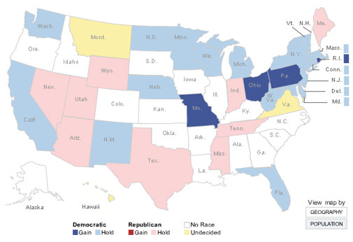 Well its the day after the midterm elections and there were quite a few changes in office. The New York Times has a very [cool interactive map](http://www.nytimes.com/ref/elections/2006/House.html) on the election results. I spent the past few evenings getting some of my election coverage information from [John Stewart’s Daily Show “Midterm Midtacular”](http://www.comedycentral.com/shows/the_daily_show/videos/indecision2006/index.jhtml) which was hilarious (and pretty informative) and then I succumbed to [mainstream coverage](http://www.cnn.com/ELECTION/2006/) last night, which was pretty good, actually.