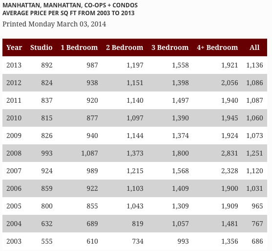 In a market with one of the highest per capita population density for a US city, there is a premium for larger contiguous space so perhaps that is why we have so many pizza joints. Here is an price per square foot table by apartment size – you can see how ppsf expands with apartment size consistently over the decade (actually it has shown this pattern for the past 25 years). It’s expensive to get more living area in Manhattan.