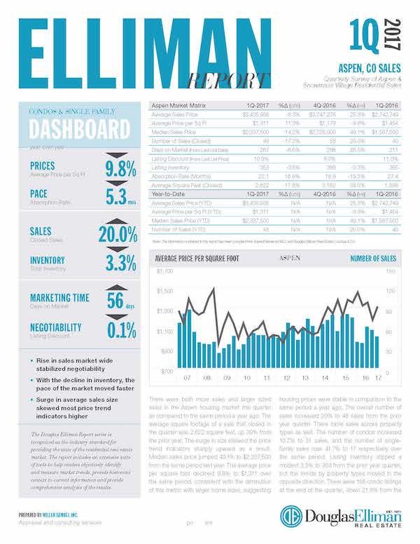 ASPEN There were both more sales and larger sized sales in the Aspen housing market this quarter as compared to the same period a year ago. The average square footage of a sale that closed in the quarter was 2,622 square feet, up 39% from the prior year. The surge in size skewed the price trend indicators sharply upward as a result. Median sales price jumped 49.1% to $2,337,500 from the same period last year…