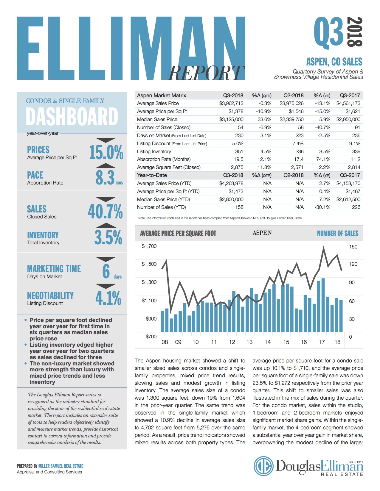 The Aspen housing market showed a shift to smaller sized sales across condos and singlefamily properties, mixed price trend results, slowing sales and modest growth in listing inventory. The average sales size of a condo was 1,300 square feet, down 19% from 1,604 in the prior-year quarter. The same trend was observed in the single-family market which showed a 10.9% decline in average sales size…