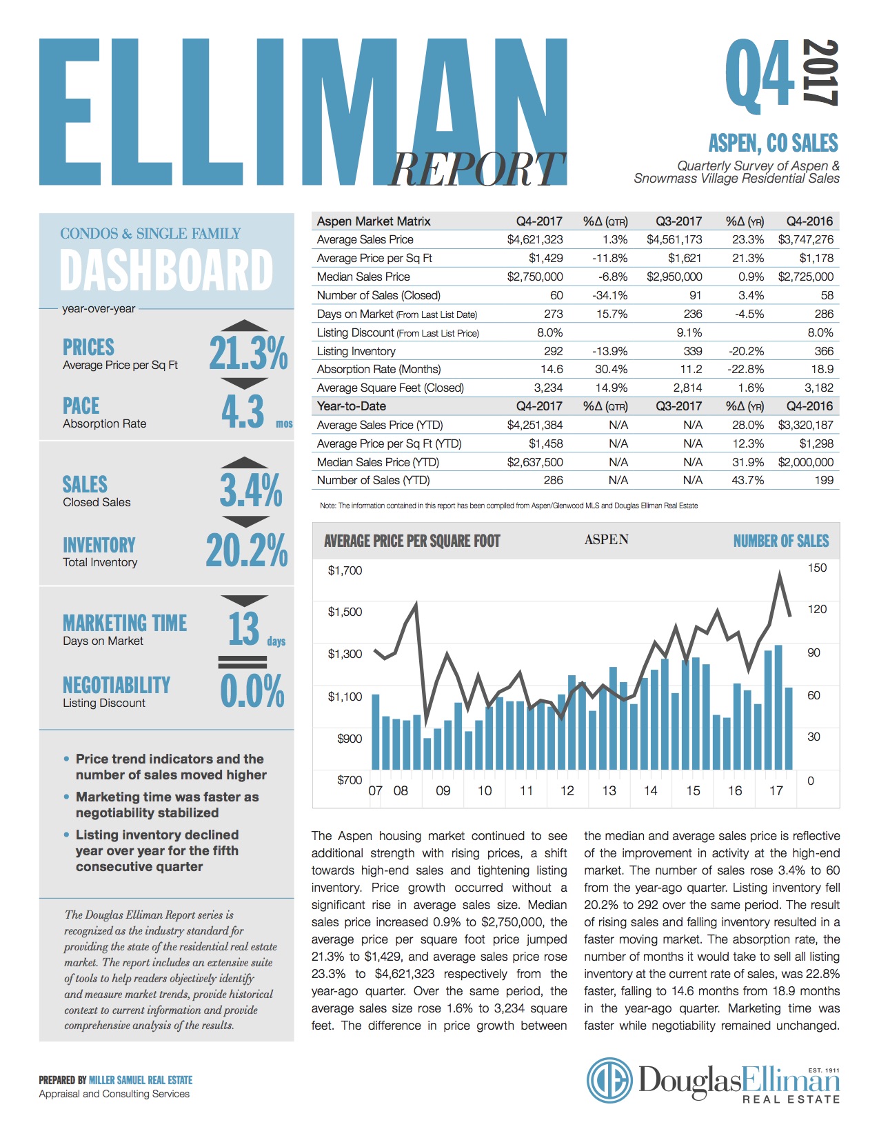 The Aspen housing market continued to see additional strength with rising prices, a shift towards high-end sales and tightening listing inventory. Price growth occurred without a significant rise in average sales size. Median sales price increased 0.9% to $2,750,000, the average price per square foot price jumped 21.3% to $1,429, and average sales price rose 23.3% to $4,621,323 respectively from the year-ago quarter. Over the same period, the average sales size rose 1.6% to 3,234 square…