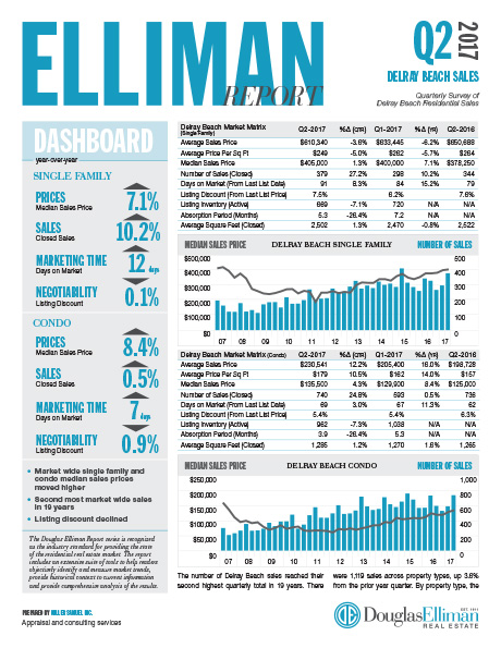 The number of Delray Beach sales reached their second highest quarterly total in 19 years. There were 1,119 sales across property types, up 3.6% from the prior year quarter. By property type, the number of single family sales rose 10.2% to 379, and the number of condo sales rose 0.5% to 740 respectively over the same period. Median sales price moved higher as well. Single family median sales price increased 7.1% to $405,000, and condo median sales price increased 8.4% to $135,500 respectively from the prior year quarter…