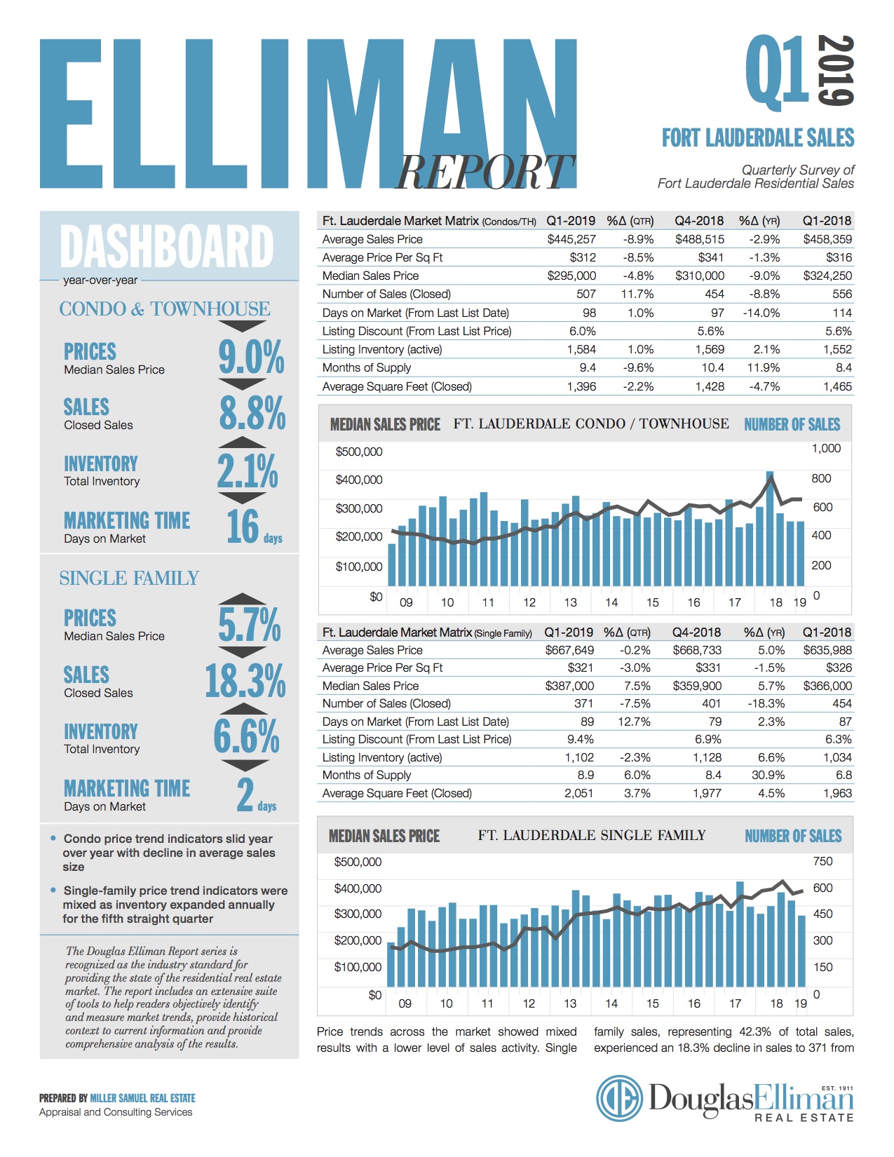 Price trends across the market showed mixed results with a lower level of sales activity. Single family sales, representing 42.3% of total sales, experienced an 18.3% decline in sales to 371 from the same period last year. Condo sales, comprising 57.7% of the market, followed the same pattern but did not see the same level decline that single families did. There were 507 sales to close in the quarter, down 8.8% over the same period. Listing inventory edged up for condos and single families…