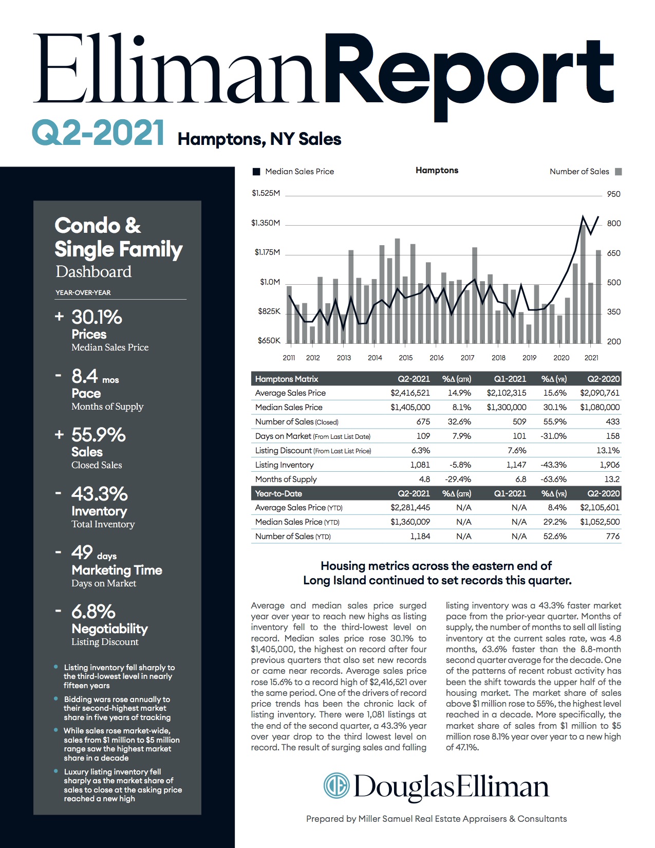Average Median and Sales median Price sales price Hamptons year over year to reach new highs as listing inventory fell to the third-lowest level on record. Median sales price rose 30.1% to $1,405,000, the highest on record after four previous quarters that also set new records or came near records. Average sales price rose…