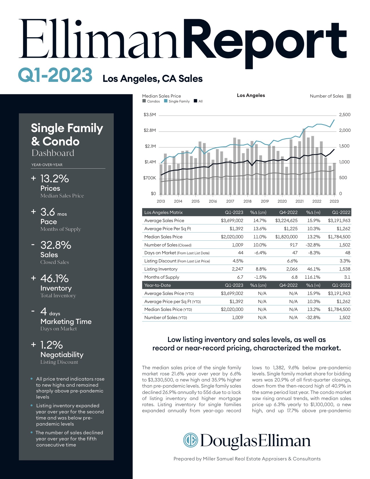 The median sales price of the single family market rose 21.6% year over year by 6.6% to $3,330,500, a new high and 35.9% higher than pre-pandemic levels. Single family sales declined 26.9% annually to 556 due to a lack of listing inventory and higher mortgage rates. Listing inventory for single families…