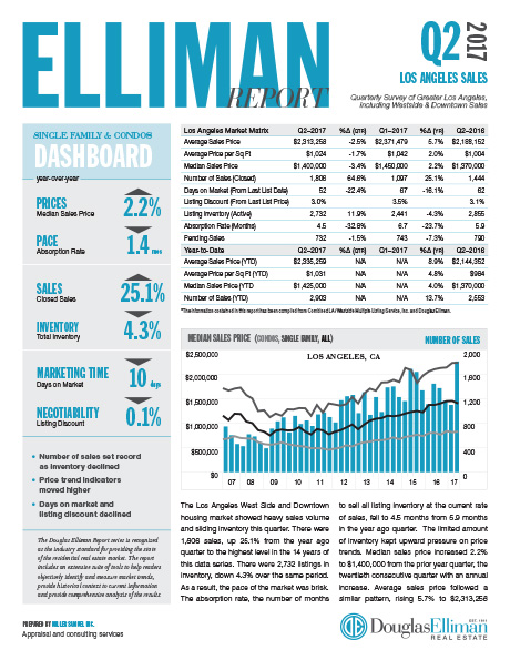 The Los Angeles West Side and Downtown housing market showed heavy sales volume and sliding inventory this quarter. There were 1,806 sales, up 25.1% from the year ago quarter to the highest level in the 14 years of this data series. There were 2,732 listings in inventory, down 4.3% over the same period. As a result, the pace of the market was brisk. The absorption rate, the number of months to sell all listing inventory at the current rate of sales, fell to 4.5 months from 5.9 months in the year ago quarter…