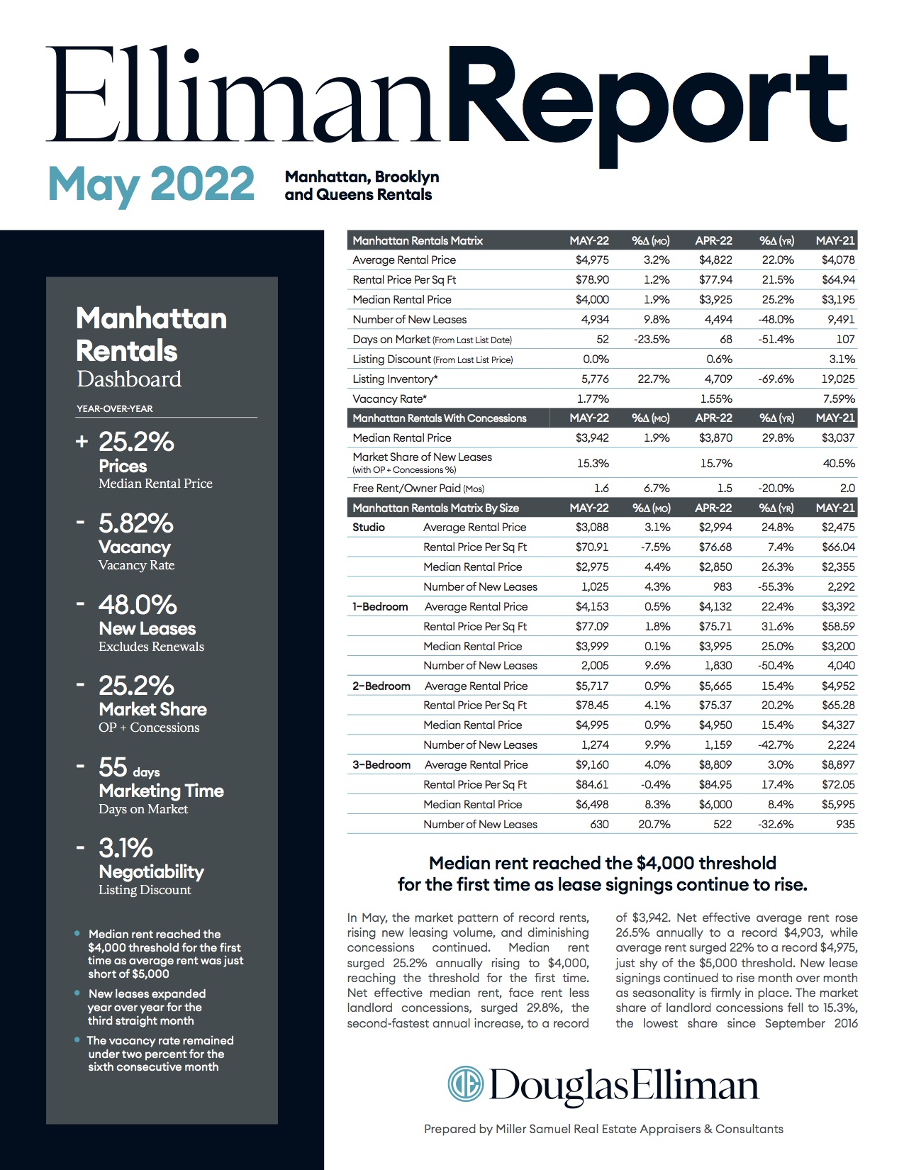 MANHATTAN In May, the market pattern of record rents, rising new leasing volume, and diminishing concessions continued. Median rent surged 25.2% annually rising to $4,000, reaching the threshold for the first time…