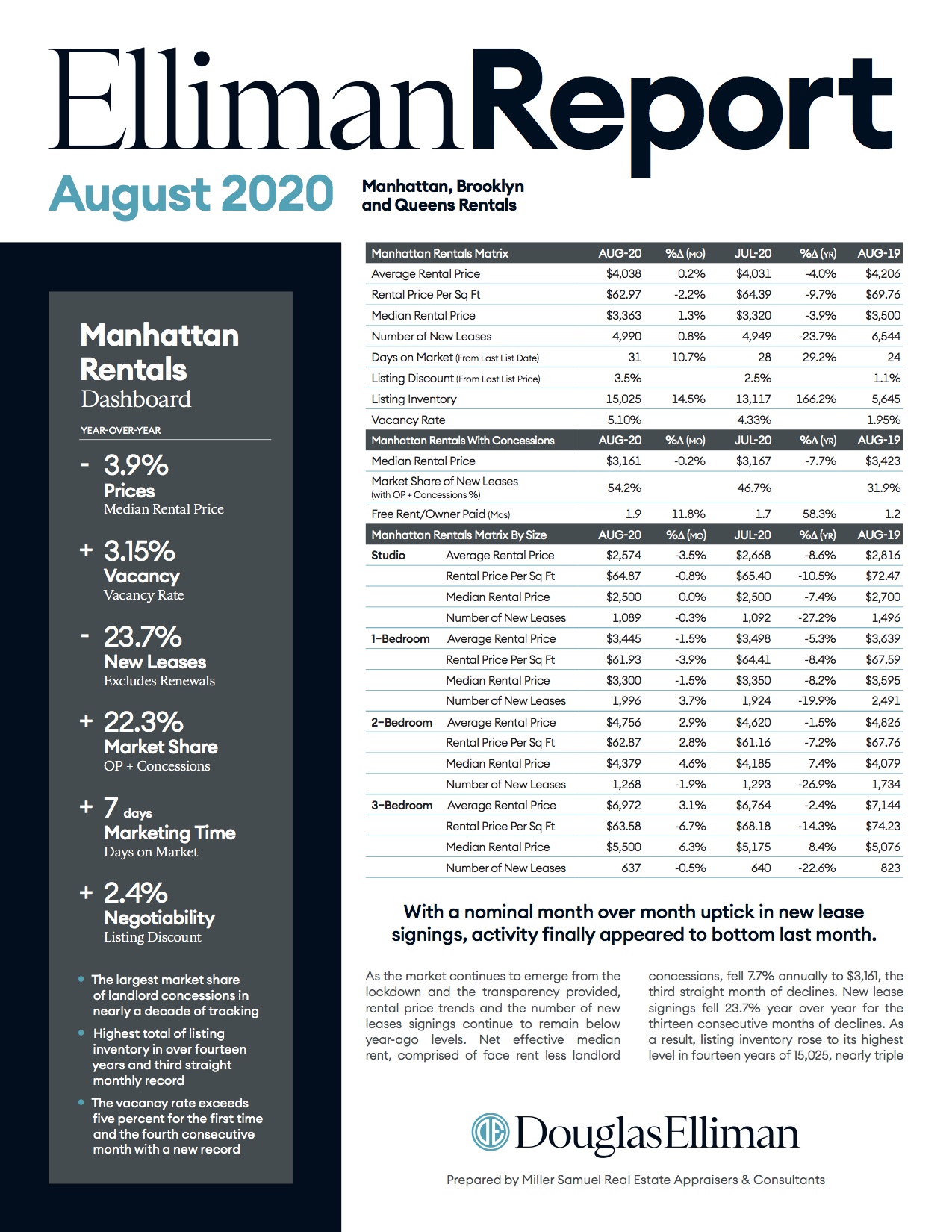 MANHATTAN As the market continues to emerge from the lockdown and the transparency provided, rental price trends and the number of new leases signings continue to remain below year-ago levels. Net effective median rent, comprised of face rent less landlord concessions, fell 7.7% annually to $3,161, the third straight month of declines. New lease signings fell 23.7% year…