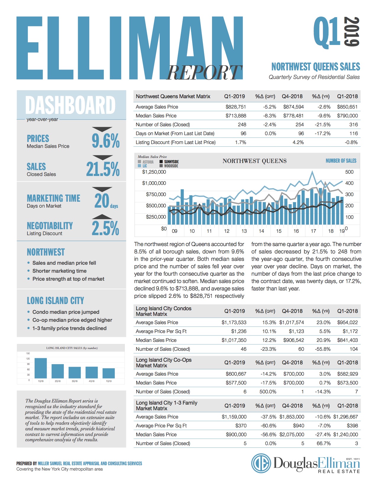 The northwest region of Queens accounted for 8.5% of all borough sales, down from 9.6% in the prior-year quarter. Both median sales price and the number of sales fell year over year for the fourth consecutive quarter as the market continued to soften. Median sales price declined 9.6% to $713,888, and average sales price slipped 2.6% to $828,751 respectively…