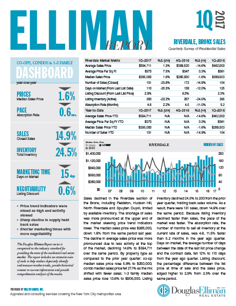 Sales declined in the Riverdale section of the Bronx, including Fieldston, Hudson Hill, North Riverdale and Spuyten Duyvil, limited by available inventory. The shortage of sales was more pronounced at the upper end of the market skewing price trend indicators lower. The median sales price was $285,000, down 1.6% from the same period last year. The decline in average sales price was more pronounced due to less activity at the top of the market, declining 14.6% to $394,711 over the same period. By property type as compared to the prior year quarter: co-op median sales price rose 5.8% to $250,000; condo median sales price fell 27.1% as the mix shifted with fewer sales; 1-3 family median sales price rose 13.6% to $906,000. Listing inventory declined 24.5% to…
