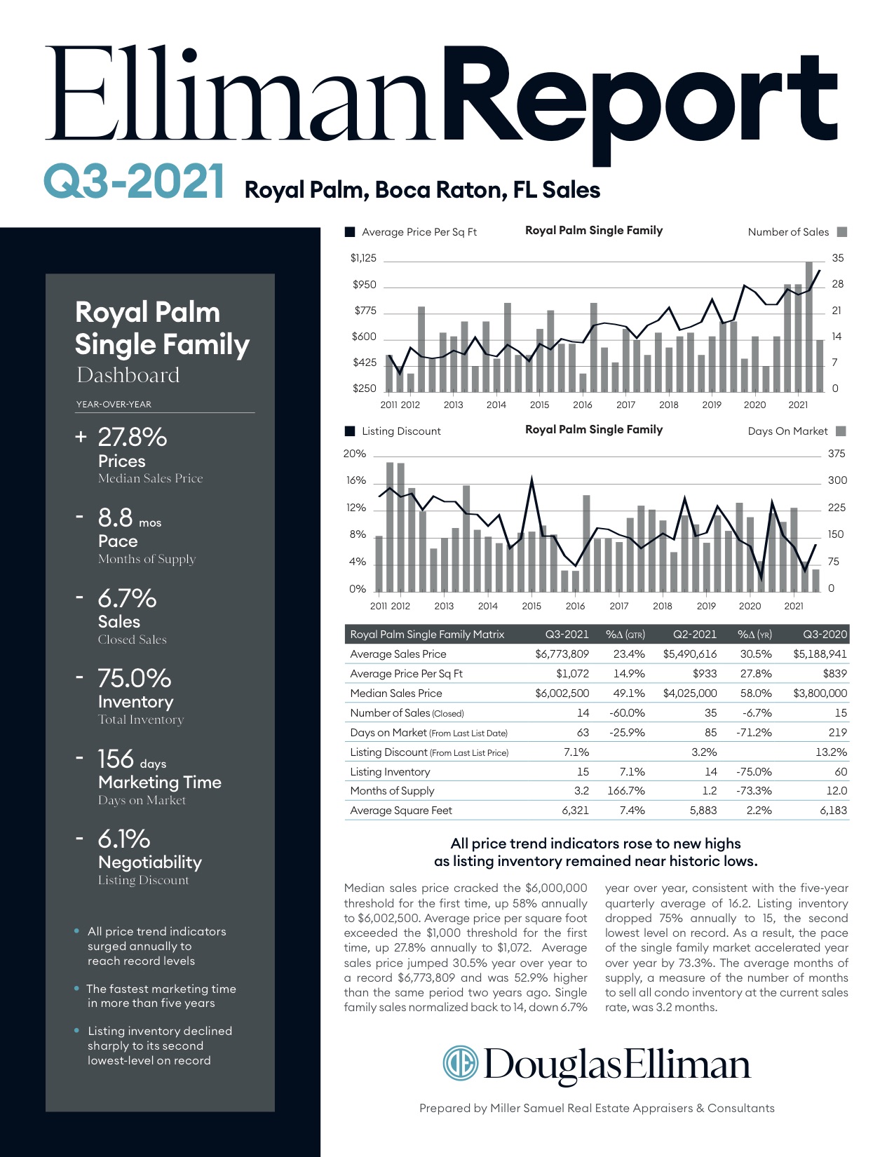 Median sales price cracked the $6,000,000 threshold for the first time, up 58% annually to $6,002,500. Average price per square foot exceeded the $1,000 threshold for the first time, up 27.8% annually to $1,072. Average sales price jumped 30.5% year over year to a record $6,773,809 and was 52.9% higher…
