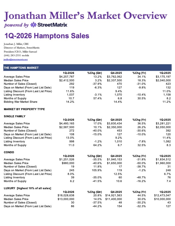 Jonathan Miller’s Market Overview: Hamptons Sales 1Q 2026