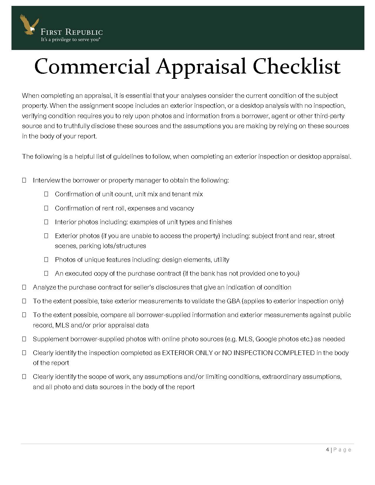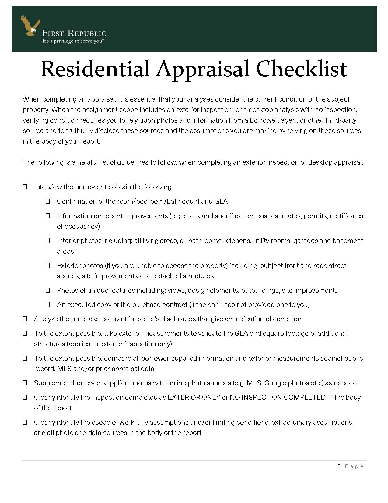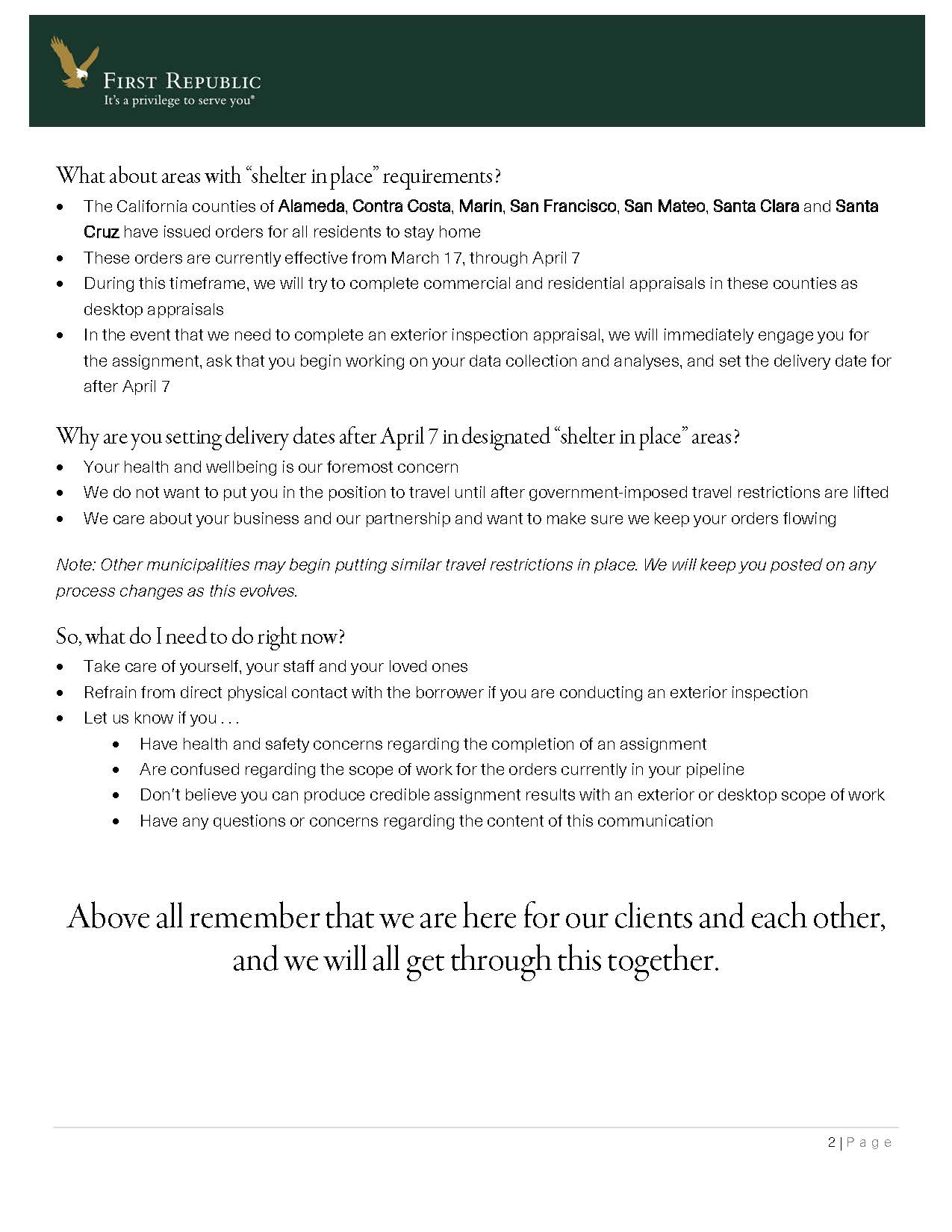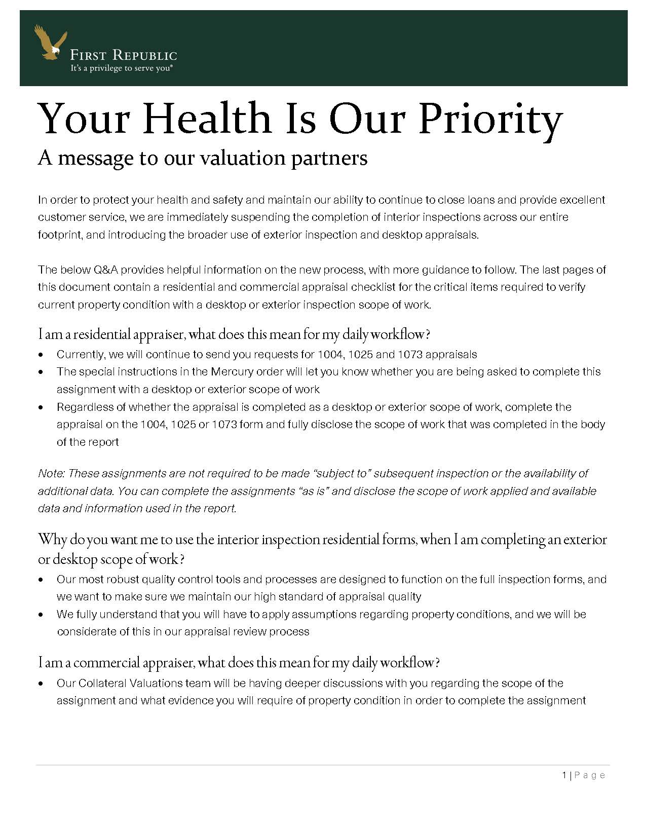 I submitted a temporary driveby appraisal solution to First Republic Bank, a large CA/NYC+ lender we have worked with since 1999. I feared for the safety of our appraisal staff and didn’t want to risk infecting others. Plus we were starting to get pushback from homeowners who are getting uncomfortable. They embedded this solution within days. I challenge any appraiser to name any other bank that is more professional, more appraiser-centric than they are. Here is the note they sent out to their panel.