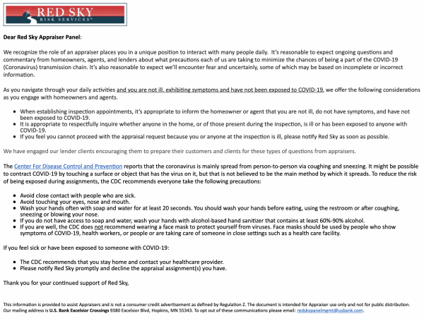 If you’ll note in this pattern of negligent behavior, great efforts were made to plan for the safety of order staff, but no regard for the safety of the appraiser, who is providing the service – telling appraisers to wash their hands and practice social-distancing when they know that it is not enough. When you get right down to it, these companies sent similar silly instructions so they can check off a box to be compliant. Yet they must know that appraisers could be carriers, and occupants in the property could be carriers. This is not business as usual.