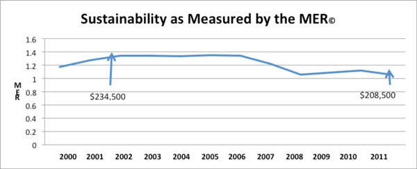 When my friend purchased her house in 2002, the ratio between RCNLD and home prices (Market Experience Ratio©, or MER©) in the immediate area was 135%. Her home and the neighboring homes were being built and sold at the high point of what would become known as the housing bubble. For those of us who watch relationships closely and have developed a means of monitoring them on both a broad scale and granular basis, this was obvious. Each time this occurs, as it has on several occasions in the past 30 years, market prices respond by declining to a level that more closely approximates depreciated replacement cost. The current MER for homes in the area of my friend’s house is 106%. The ratio is still declining slowly, but prices have reached reasonably sustainable levels.