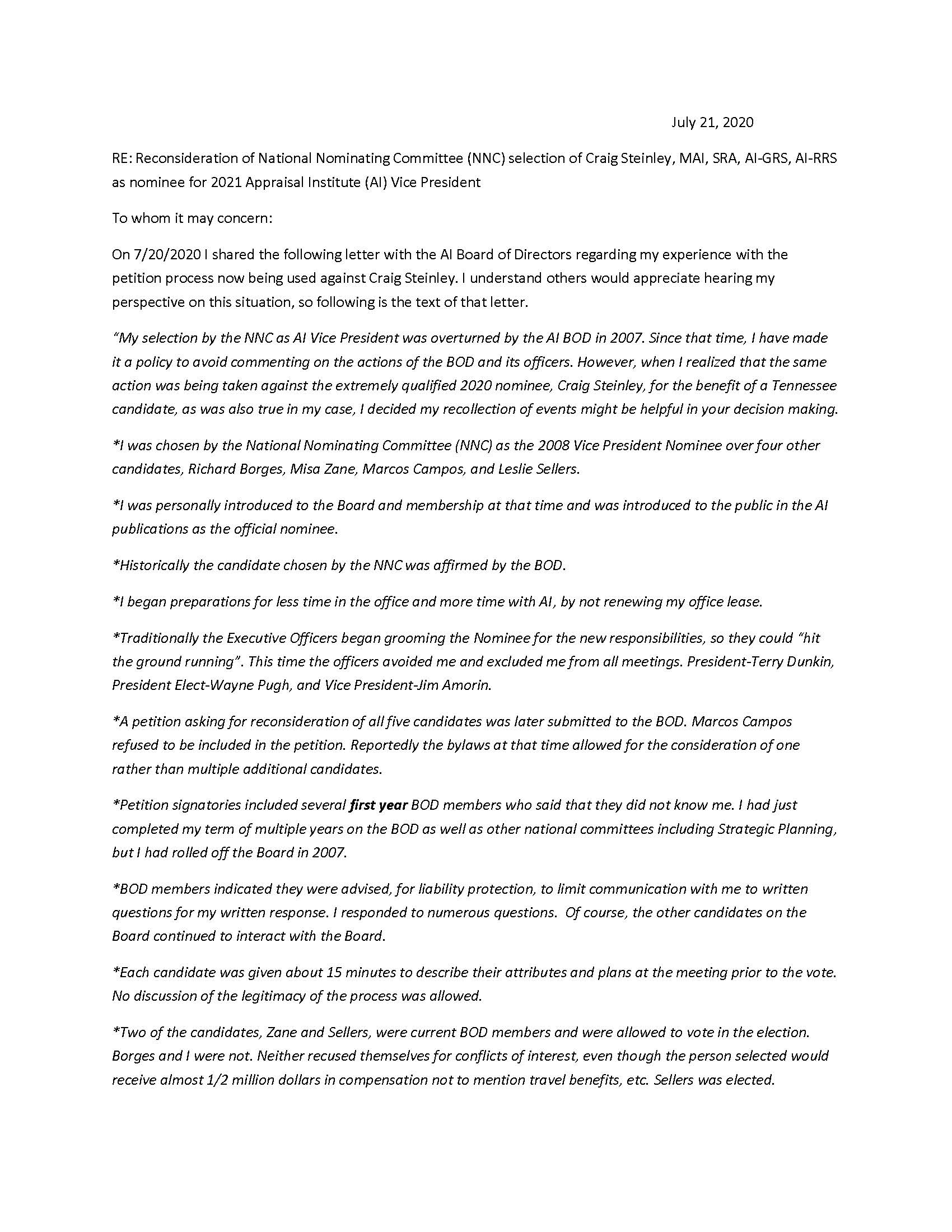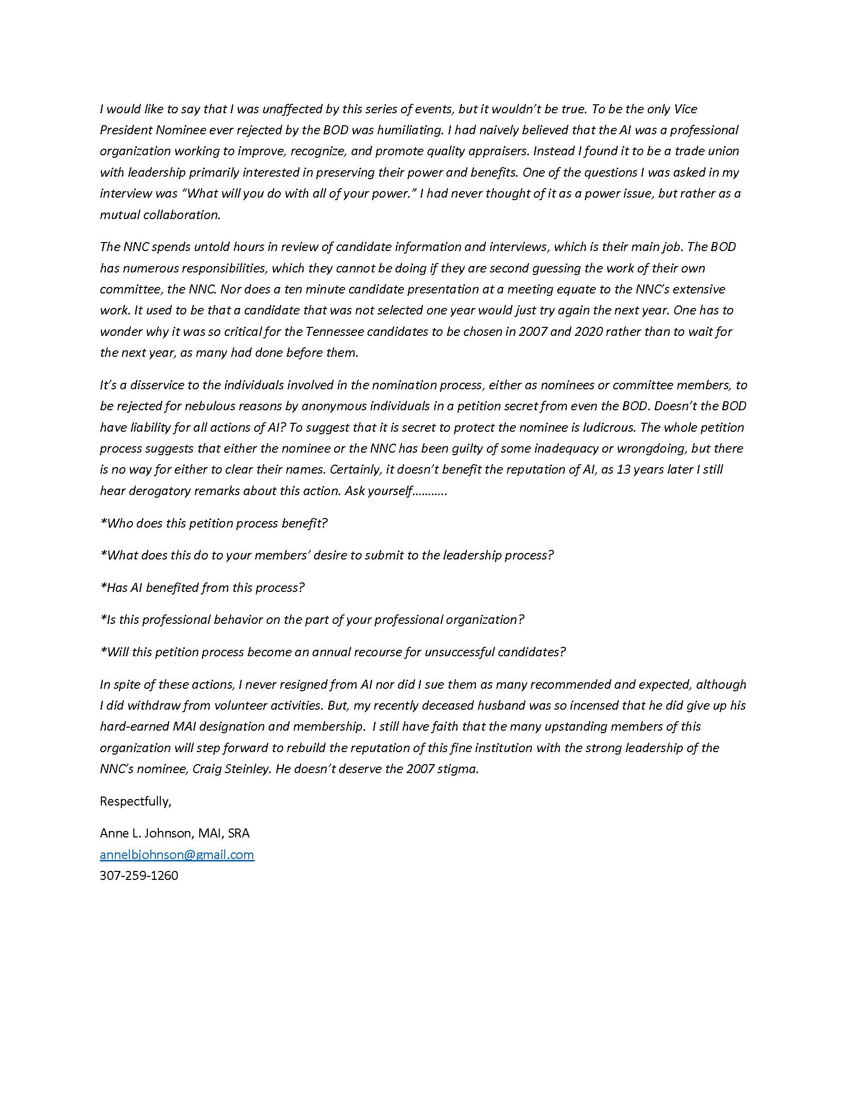 Anne L. Johnson lays the situation out in her July 21, 2020 note that was sent in support of Craig Steinley, the current (only legitimate) nominating committee choice. I’m sure all board members are aware of this dark moment in Appraisal Institute history more than a decade ago and now is the time to start asking questions and demonstrate integrity. Fingers crossed.